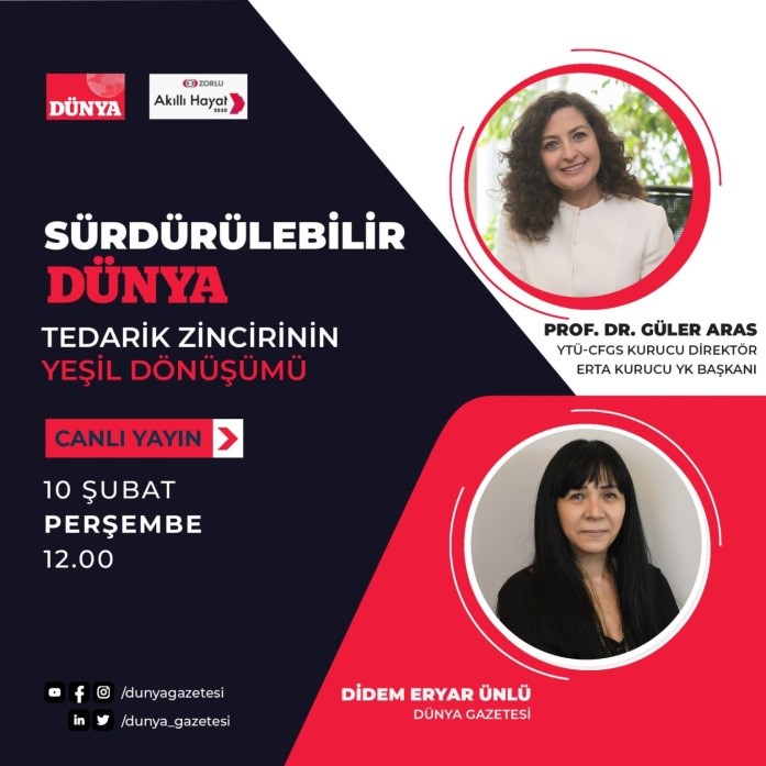 Kurucu Yönetim Kurulu Başkanımız Prof. Dr. Güler Aras 10 Şubat (Perşembe) günü saat 12:00'de Zorlu Holding Sürdürülebilirlik Vizyonu ve Akıllı Hayat 2030 desteğiyle yayınlanan "Sürdürülebilir Dünya" programında Didem Eryar Ünlü'nün canlı yayın konuğu olmuştur. Canlı yayın, Dünya Gazetesi sosyal medya hesapları aracılığı ile gerçekleşmiştir.