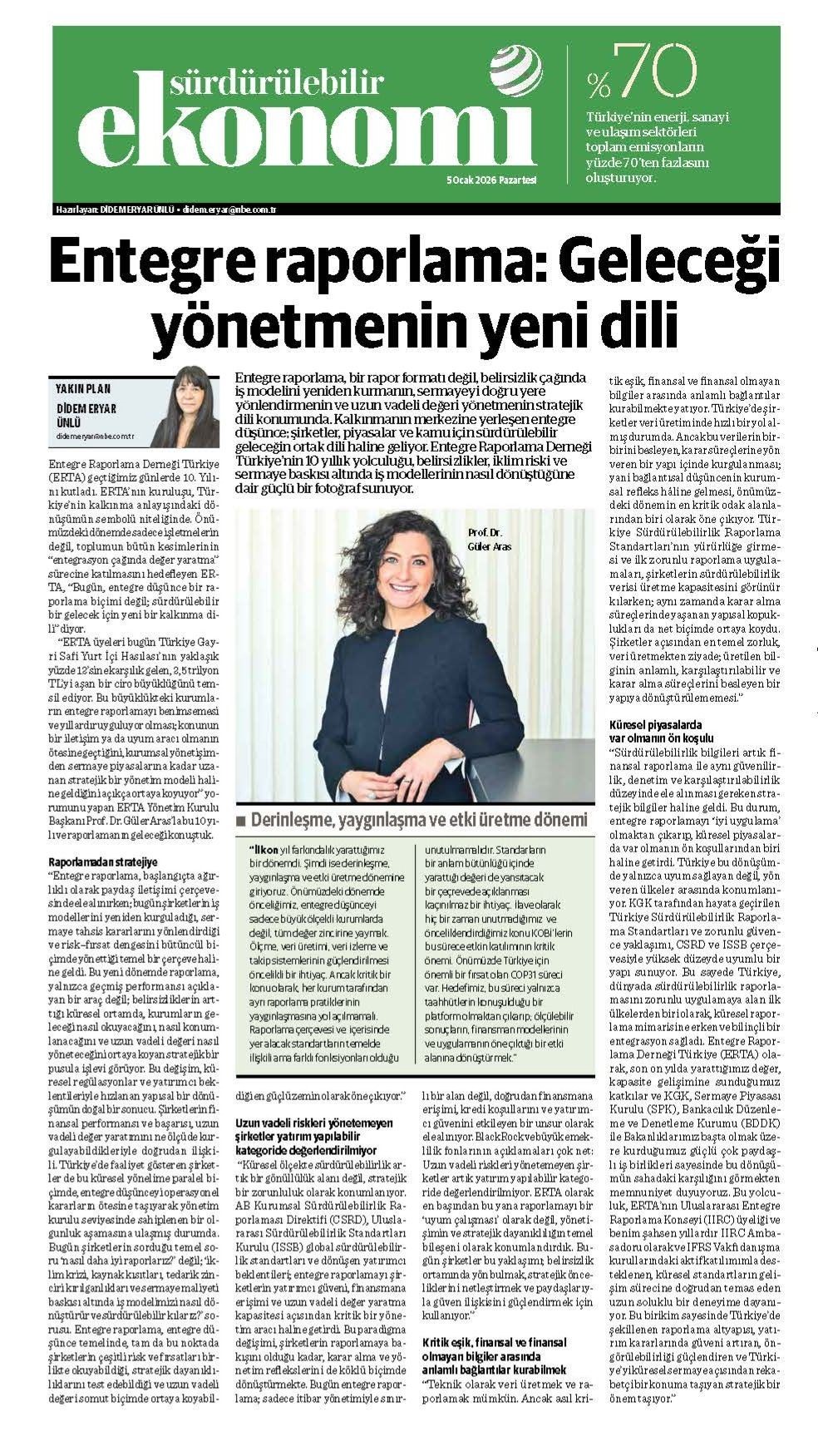 Yönetim Kurulu Başkanımız Prof. Dr. Güler Aras’ın, Ocak ayında Nasıl Bir Ekonomi (Ekonomim) gazetesinde yayımlanan “Entegre Raporlama: Geleceği Yönetmenin Yeni Dili” başlıklı söyleşisi okuyucularla buluştu. Söyleşide; entegre raporlamanın yalnızca bir raporlama yaklaşımı olmanın ötesine geçerek, kurumların iş modellerini yeniden şekillendiren stratejik bir yönetim çerçevesine dönüşümü kapsamlı bir bakış açısıyla ele alındı. Röportaj kapsamında; entegre raporlamanın kurumların stratejik karar alma ve uzun vadeli değer yaratma süreçlerine katkısı, uluslararası raporlama standartlarının Türkiye’deki uygulamalarla entegrasyonu ve ülkemizin sürdürülebilirlik ile kurumsal raporlama alanındaki küresel konumu hakkında önemli değerlendirmeler paylaşıldı.