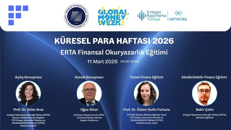11 Mart 2026 tarihinde, 14. Küresel Para Haftası (Global Money Week) kapsamında Sermaye Piyasası Kurulu (SPK) ve ERTA iş birliğiyle düzenlenen "Finansal Okuryazarlık Eğitimi" çevrimiçi olarak gerçekleştirildi. Yönetim Kurulu Başkanımız Prof. Dr. Güler Aras’ın açılış konuşmasını yaptığı programda, SPK Kurumsal İletişim Başkan Yardımcısı Oğuz Altan konuk konuşmacı olarak yer aldı. Genç profesyoneller ve üniversite öğrencilerine yönelik tasarlanan eğitimde; YTÜ CFGS Yönetim Kurulu Üyesi Prof. Dr. Özlem Kutlu Furtuna temel finans kavramları, bütçe ve nakit akışı yönetimi üzerine eğitim verirken, ERTA Akredite Eğitmeni Bekir Çetin sürdürülebilir finans yaklaşımı ve ESG kriterlerinin yatırım kararlarındaki stratejik rolünü katılımcılara aktardı.