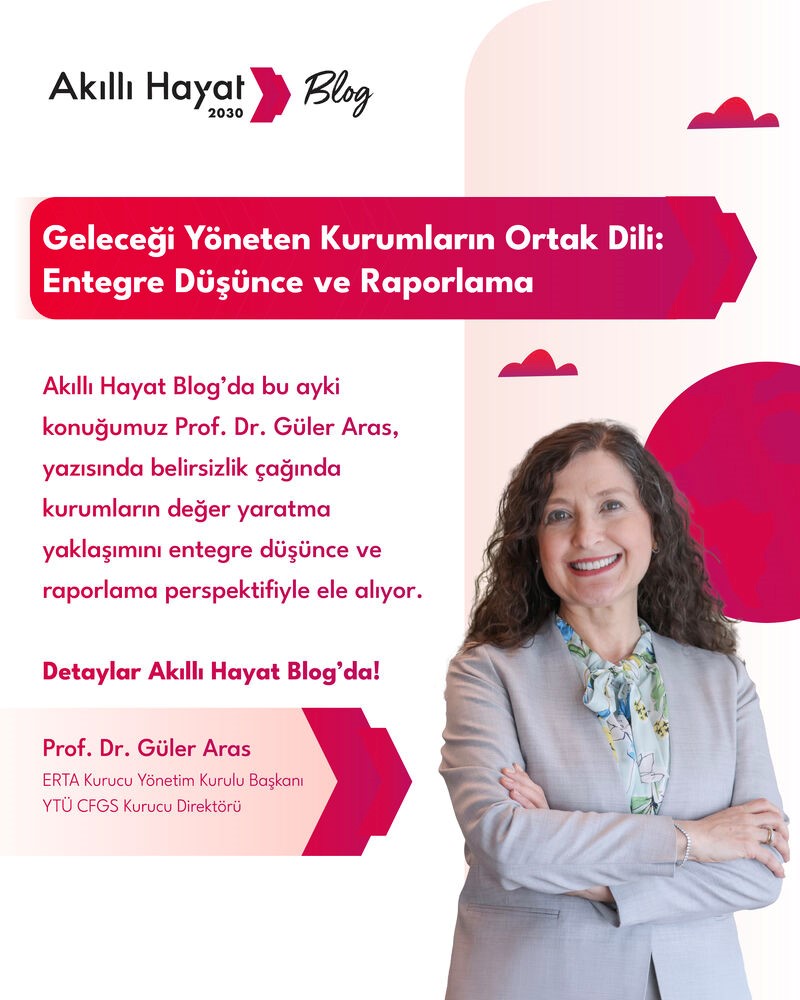 Yönetim Kurulu Başkanımız Prof. Dr. Güler Aras’ın, Akıllı Hayat Blog’da kaleme aldığı “Geleceği Yöneten Kurumların Ortak Dili: Entegre Düşünce ve Raporlama” başlıklı yazısı okuyucularla buluştu. Yazıda; çoklu risklerin birbirini tetiklediği belirsizlik çağında iş dünyasının geçirdiği dönüşüm, sistemik riskler ile şeffaflık ve güven ilişkisinin kurumsal değer yaratmadaki stratejik rolü kapsamlı bir perspektifle ele alındı. TSRS ile başlayan yeni raporlama dönemi ve entegre raporlamanın kurumsal yönetişimle kurduğu güçlü bağın değerlendirildiği yazıda ayrıca, Entegre Raporlama Derneği Türkiye’nin (ERTA) entegre düşünce ekosisteminin gelişimine sunduğu katkılara ve bu yaklaşımın kurumların uzun vadeli değer yaratma yolculuğundaki stratejik önemine dikkat çekildi.