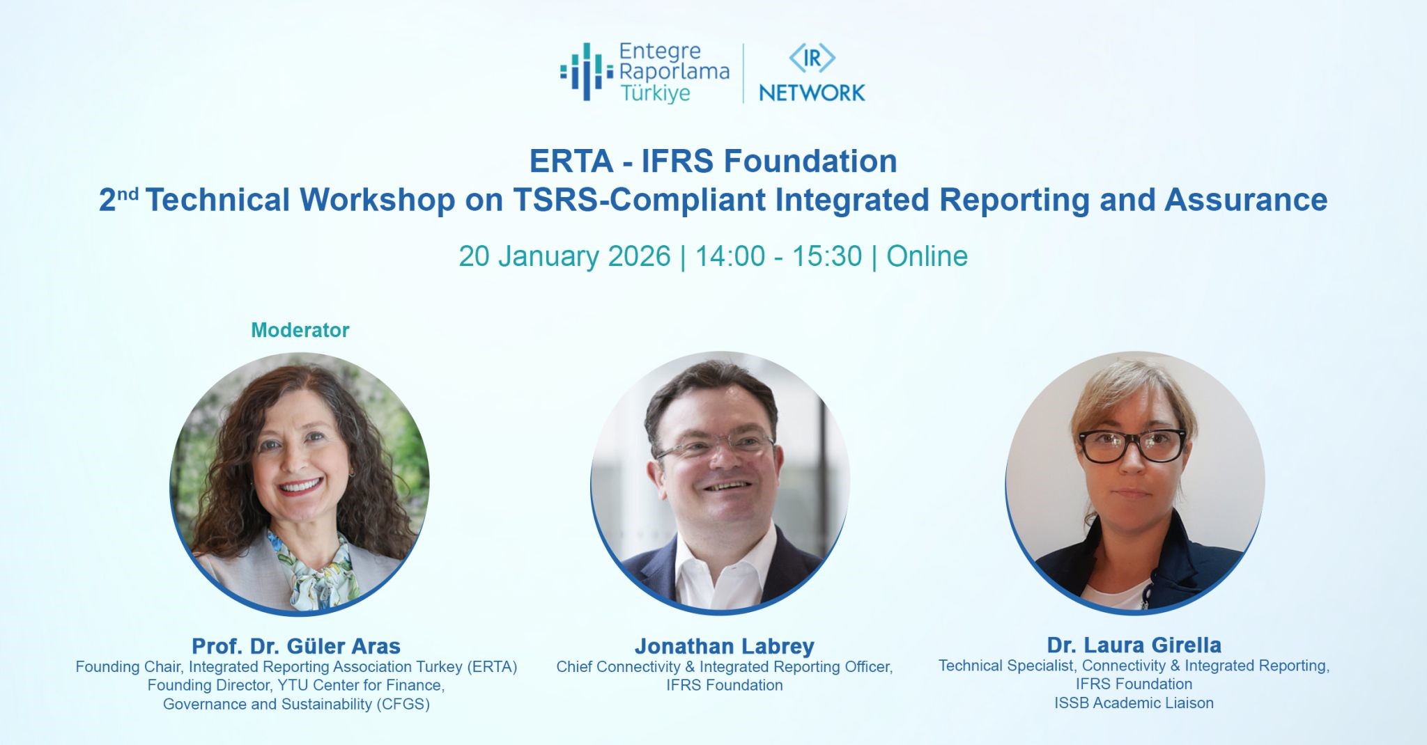 Türkiye Sürdürülebilirlik Raporlama Standartları (TSRS 1 ve 2) ile uyumlu entegre raporların hazırlanmasında karşılaşılan zorlukları ve fırsatları değerlendirmek amacıyla ERTA ve IFRS Vakfı iş birliği ile hayata geçirilen “2. TSRS Uyumlu Entegre Raporlama ve Denetimi Teknik Çalıştayı”, 20 Ocak 2026 tarihinde çevrimiçi olarak gerçekleştirildi. Yönetim Kurulu Başkanımız Prof. Dr. Güler Aras’ın moderasyonunu üstlendiği ve uluslararası standartlara uyum sürecine ilişkin güncel gelişmelerin paylaşıldığı stratejik çalıştayda; IFRS Vakfı Entegre Raporlama ve Bağlantıdan Sorumlu Üst Düzey Yöneticisi Jonathan Labrey ile IFRS Vakfı Entegre Raporlama Teknik Uzmanı ve ISSB Akademik İrtibat Sorumlusu Dr. Laura Girella konuk olarak yer aldı.