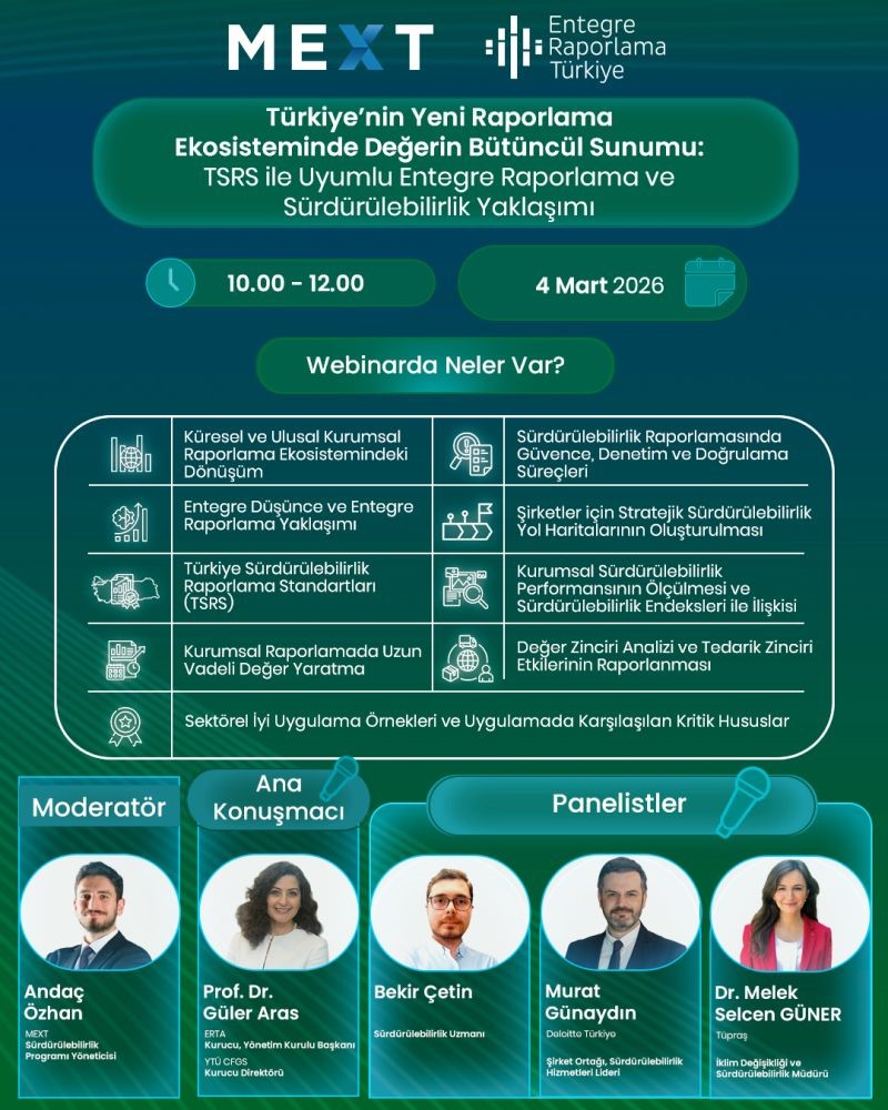 4 Mart 2026 tarihinde, ERTA ve MEXT iş birliğiyle düzenlenen “Türkiye’nin Yeni Raporlama Ekosisteminde Değerin Bütüncül Sunumu: TSRS ile Uyumlu Entegre Raporlama ve Sürdürülebilirlik Yaklaşımı” başlıklı webinar çevrimiçi olarak gerçekleştirildi. Yönetim Kurulu Başkanımız Prof. Dr. Güler Aras'ın "Ana Konuşmacı" olarak katılım sağladığı, MEXT Sürdürülebilirlik Programı Yöneticisi Andaç Özhan’ın moderatörlüğünde düzenlenen etkinlikte; Sürdürülebilirlik Uzmanı Bekir Çetin, Deloitte Türkiye Şirket Ortağı Murat Günaydın ve Tüpraş İklim Değişikliği ve Sürdürülebilirlik Müdürü Dr. Melek Selcen Güner panelist olarak yer aldı. Bu stratejik buluşmada; TSRS ile uyumlu entegre raporlama yaklaşımının kurumların uzun vadeli değer yaratma kapasitesine etkileri, ilk yıl deneyimleri ve sürdürülebilirlik performansının bütüncül sunumu farklı sektör perspektiflerinden kapsamlı bir şekilde ele alındı.