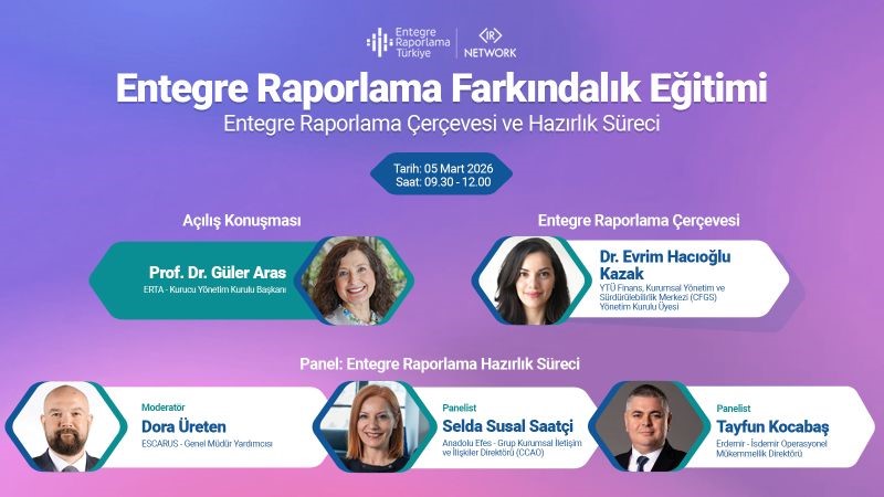 5 Mart 2026 tarihinde çevrimiçi düzenlenen etkinlik, Yönetim Kurulu Başkanımız Prof. Dr. Güler Aras’ın açılış konuşmasıyla gerçekleştirildi. YTÜ CFGS Yönetim Kurulu Üyesi Dr. Evrim Hacıoğlu Kazak’ın entegre raporlama çerçevesinin temel ilkelerini aktardığı eğitimin ardından; Escarus Genel Müdür Yardımcısı Dora Üreten’in moderatörlüğünde gerçekleşen panelde, Anadolu Efes ve Erdemir-İsdemir yöneticileri kurumlarının entegre raporlama yolculuğundaki tecrübelerini katılımcılarla paylaştı. Etkinlikte; TSRS uyumlu raporlamaya geçiş süreci, risk analizi yaklaşımları ve şirketler için güncel yol haritaları bütüncül bir yaklaşımla değerlendirildi.